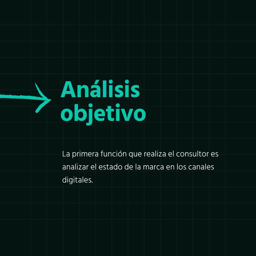 La primera función que realiza el consultor es analizar el estado de la marca en los canales digitales. Este análisis es objetivo y se encarga de detectar los puntos débiles y oportunidades de mejora, al igual que el entorno digital al que la empresa se está enfrentando. Esto es muy importante, ya que es el punto de partida para la generación de las estrategias.