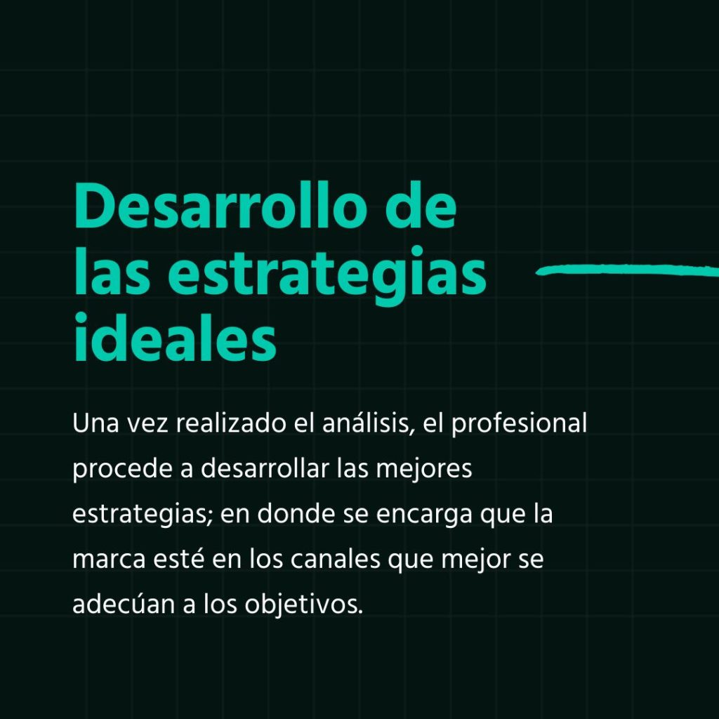 Una vez realizado el análisis, el profesional procede a desarrollar las mejores estrategias; en donde se encarga que la marca esté en los canales que mejor se adecúan a los objetivos. A la vez, procura que las campañas incluyan contenidos relevantes, de calidad y que estén en tendencia, con el fin de que puedan captar la atención de clientes potenciales y generar los resultados esperados.